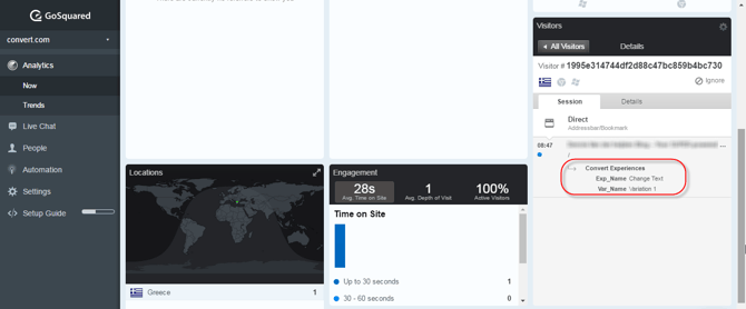 When you log in to your GoSquared account, you should go to Analytics > "Now" to see a minute by minute timeline of the web traffic or go to "People" to know what experiments/variations your visitors are bucketed into.