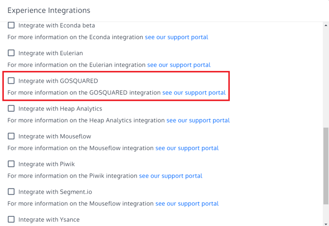 Go to your Convert experience settings and under Integrations select the GoSquared. Then click Save and Continue. Once this is activated, all your visitor traits will be translated and passed through to the GoSquared Analytics and live chats without any mapping or configuration. The same goes for eCommerce events.