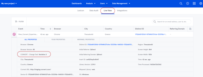 After experiment is running and Mixpanel integration is activated, you will start seeing in your Mixpanel Live View, for every visitor that participated in an experiment, a new property named like "Convert - [Experiment name here]" and which has as value the variation name presented to that visitor.