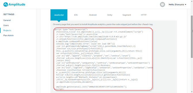 Then, create an Amplitude account. If you have not already done so, go to https://amplitude.com and register for an account. Then, create an organization and a project. You will immediately receive an API Key for the project you have just created. On every page that you want to install Amplitude analytics, paste the code snippet just before the </head> tag.