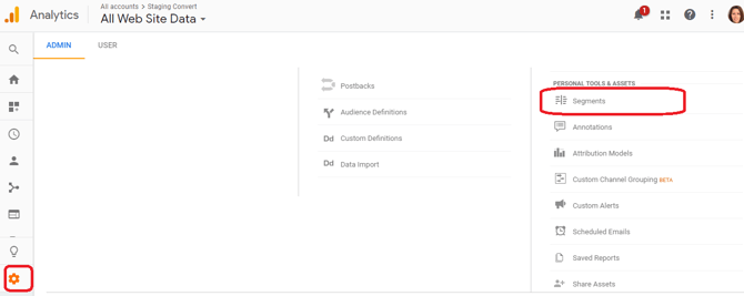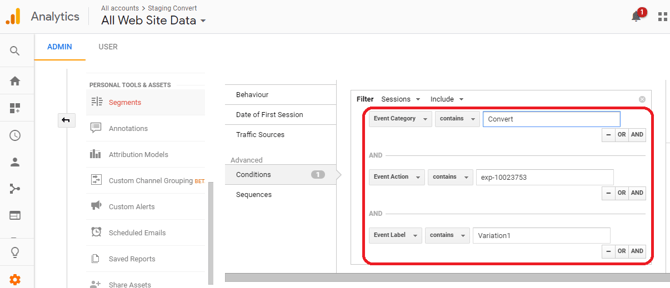 Now you are able to create segments in Google Analytics for each of the variations. Segments are available in Admin left menu and then under Personal Tools & Assets: