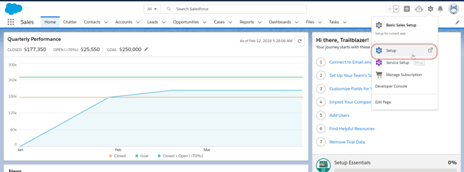 First thing you need to do is to install the Bizible Marketing Analytics package to your Salesforce account. Go to the Setup side of Salesforce: