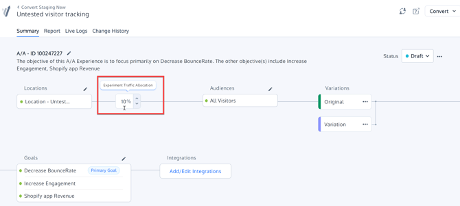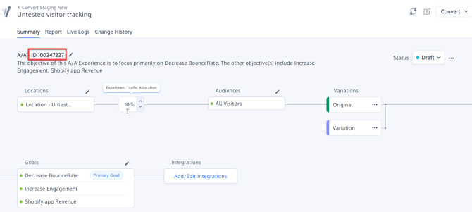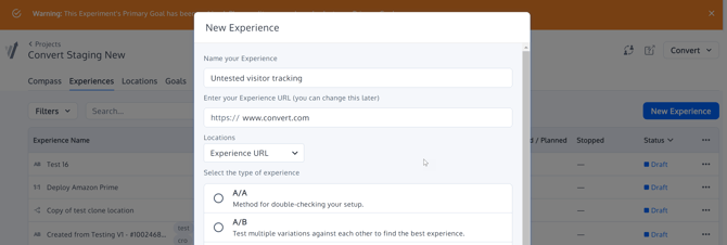 - First, create an A/A experiment and name it Untested Visitor Tracking. Set it on any page that you like. We will modify the Locations settings later.