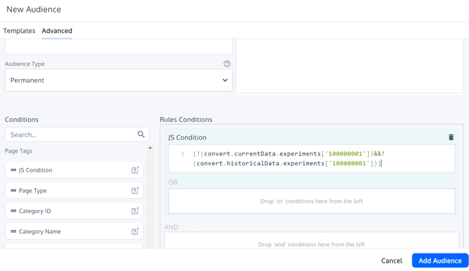 Make sure you replace the 100000001 with the experiment id of the Untested Visitors AA experiment. Also, make sure that if you need to add another audience on AND fashion, you need to add inside the same Custom Audience.