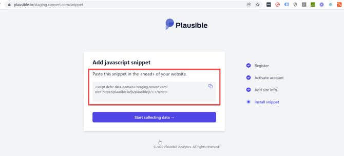 To set up the integration, you should install the Plausible tracking code according to their instructions. It looks like this: